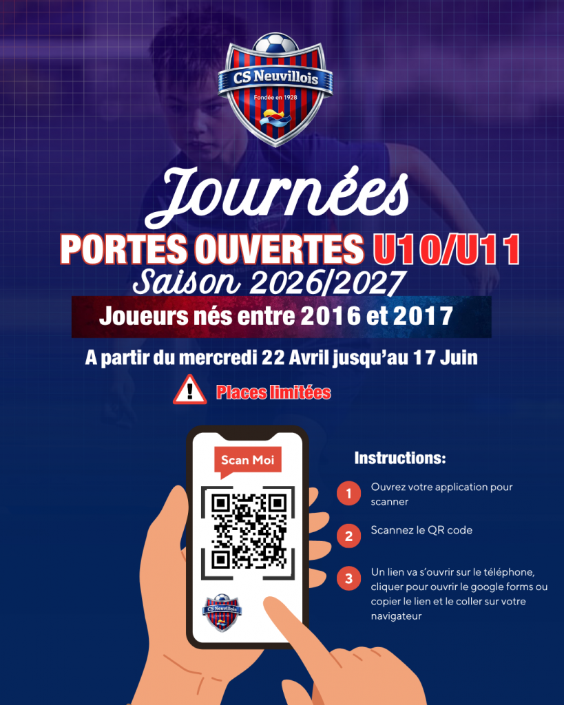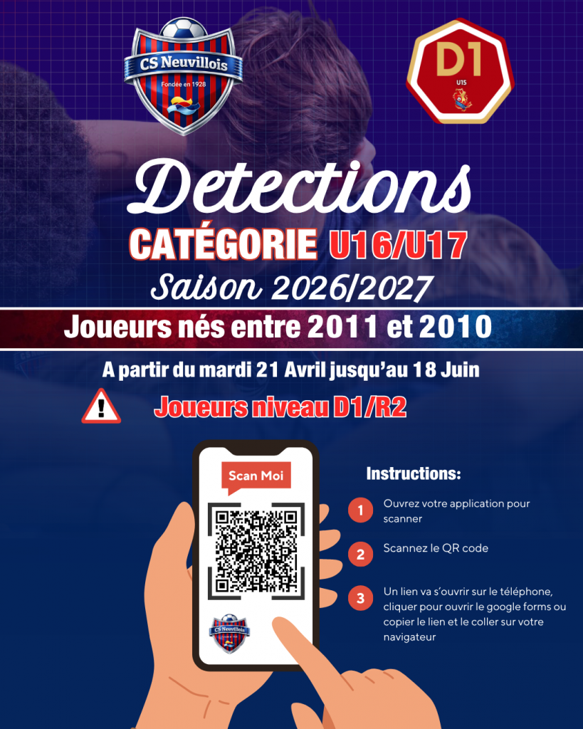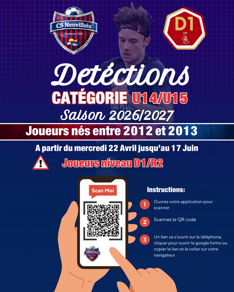 LE CLUB ÉVÉNEMENTS RÉSULTATS LICENCES 2025-2026 BROCANTE CSN SPONSORS ACTUALITES LES ÉQUIPES Menu LE CLUB ÉVÉNEMENTS RÉSULTATS LICENCES 2025-2026 BROCANTE CSN SPONSORS ACTUALITES LES ÉQUIPES STAGES CSN TOURNOI INTERNATIONAL BOUTIQUE DETECTIONS 2025-2026 ACADEMIE DU MERCREDI BILLETTERIE TI Menu STAGES CSN TOURNOI INTERNATIONAL BOUTIQUE DETECTIONS 2025-2026 ACADEMIE DU MERCREDI BILLETTERIE TI LE CLUB ÉVÉNEMENTS ACADEMIE DU MERCREDI TOURNOI INTERNATIONAL RÉSULTATS ÉQUIPES SPONSORS DÉTECTIONS 2025-2026 Licence 2025-2026 BOUTIQUE STAGES CSN ACADEMIE DU MERCREDI Menu LE CLUB ÉVÉNEMENTS ACADEMIE DU MERCREDI TOURNOI INTERNATIONAL RÉSULTATS ÉQUIPES SPONSORS DÉTECTIONS 2025-2026 Licence 2025-2026 BOUTIQUE STAGES CSN ACADEMIE DU MERCREDI Les détections du CS Neuville Pour s’inscrire il vous suffit de remplir de scanner le QR CODE correspondant à votre catégorie.